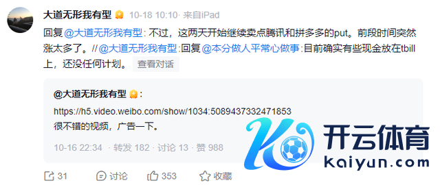 10月18日,段永平再暗示:“这两天初始继续卖点腾讯和拼多多的put。前段时辰一霎涨太多了。”