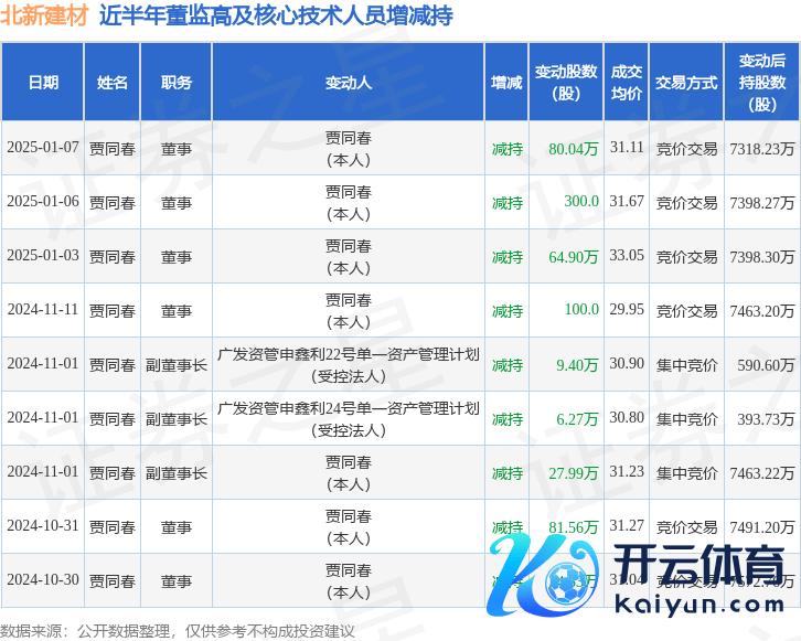 证券之星音问,说明1月8日阛阓公开信息、上市公司公告及交游所败露数据整理,北新建材(000786)最新董监高及关系东说念主员股份变动情况:2025年1月7日公司董事贾同春共减捏公司股份80.04万股,占公司总股本为0.0474%。变动时辰公司股价下降1.02%,1月7日当日收盘报31.1元。