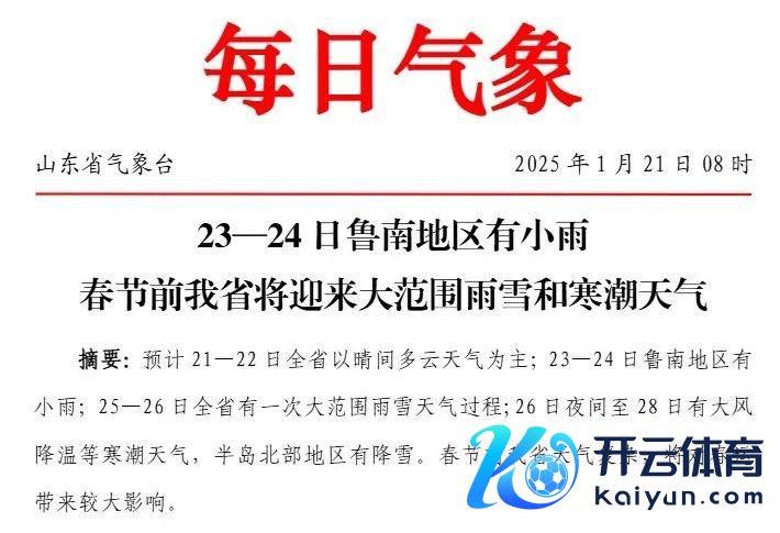 25-26日,全省天气阴,菏泽、济宁和鲁西北地区有小雨或雨夹雪转小到中雪局部大雪,其他地区有小雨或雨夹雪转小雪北风,滨州、东营、潍坊、日照、内陆湖面和半岛地区3~4级增强到5~6级阵风7~8级,其他地区3~4级增强到4~5级阵风6~7级。