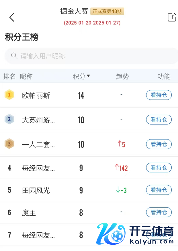 在逐日经济新闻APP举办的掘金大赛第48期比赛中,目下比赛参加终末冲刺阶段,多位选手火速报名入场,不才周一将揭晓本期比赛的冠军,在本期比赛竣事,优秀选手有望获取周赛奖励和月度积分王奖励。比赛报名本事为1月18日到1月27日,比赛本事为1月20日到1月27日。