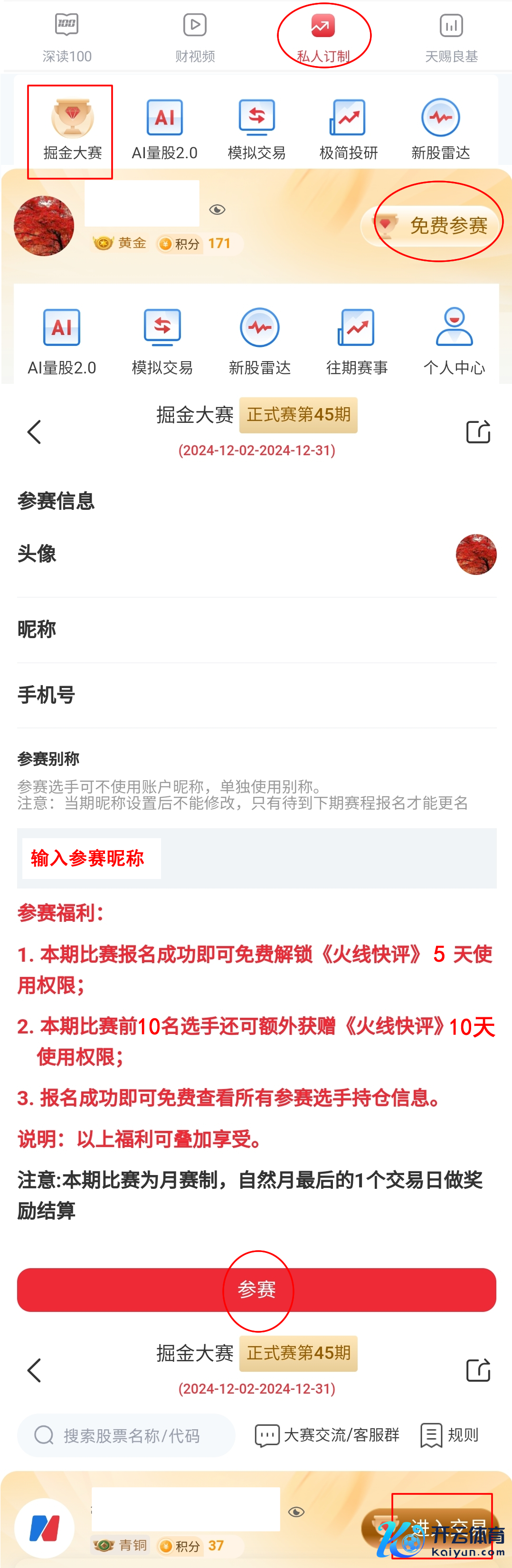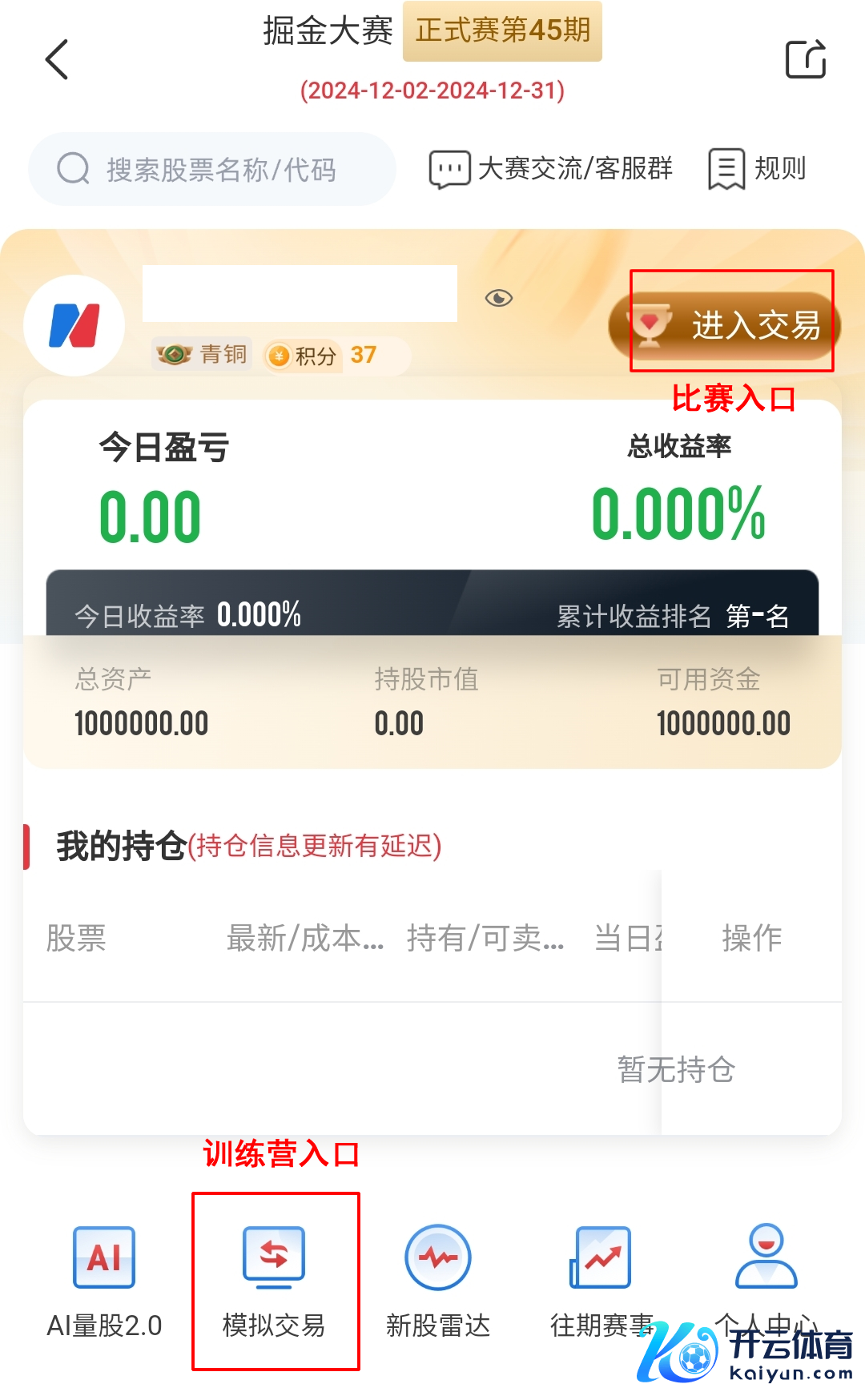 需要领导的是,最近一些选手把磨砺营当成了比赛,在掘金大赛首页的“模拟交往”栏目中,这是磨砺营进口。点击掘金大赛的右上角“参加交往”,这才是比赛进口。磨砺营目下莫得奖励,也莫得捏仓本事罢休,不错用来磨砺我方的投资妙技。