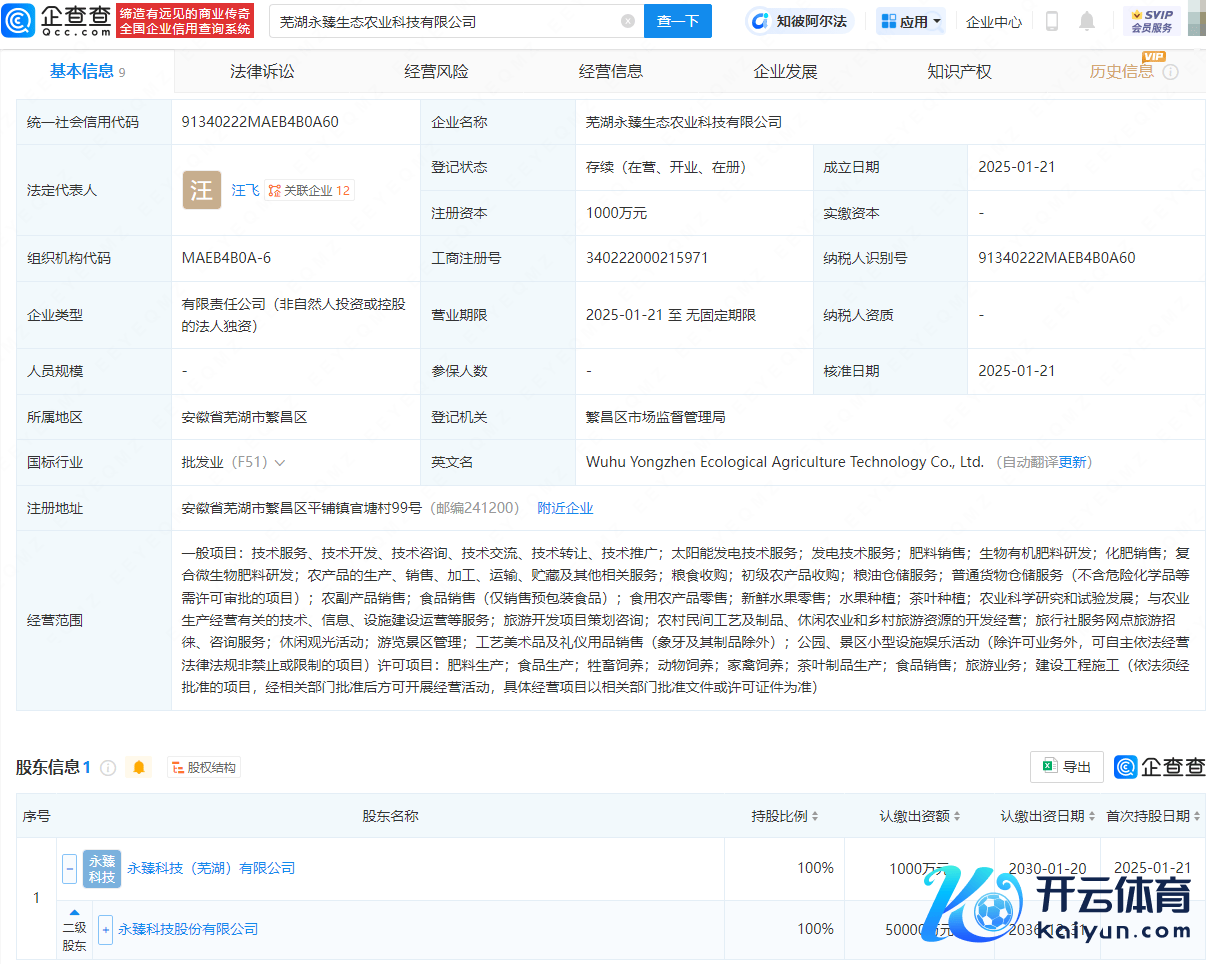 企查查APP袒露,近日,芜湖永臻生态农业科技有限公司缔造,法定代表东谈主为汪飞,注册本钱为1000万元,蓄意鸿沟包含:太阳能发电技能劳动;发电技能劳动;肥料销售;生物有机肥料研发;化肥销售;食粮收购;低级农家具收购等。企查查股权穿透袒露,该公司由永臻股份(603381)波折全资抓股。