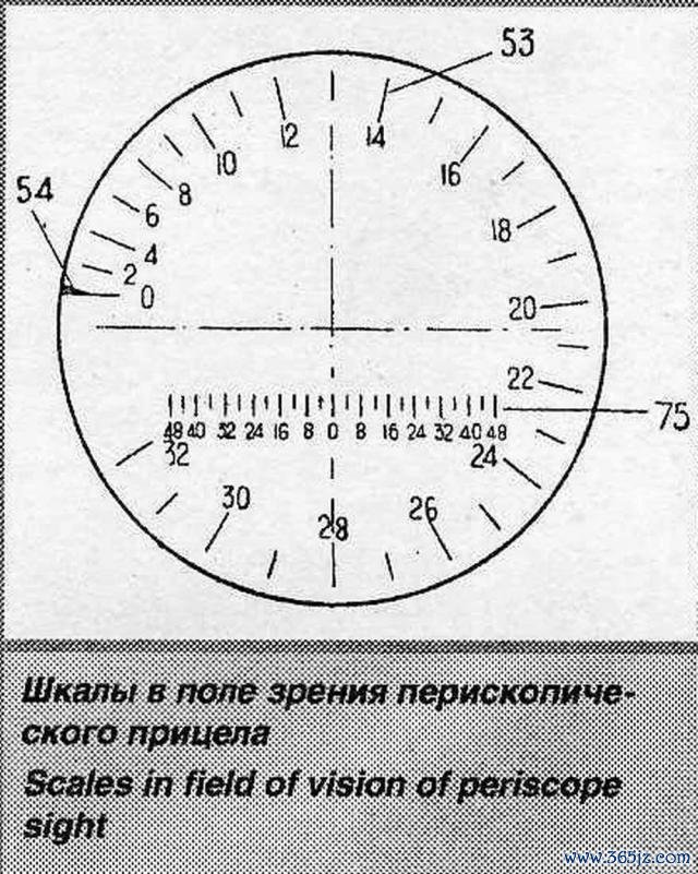 数字54是一个伏卧的指针,用于指令刻下的距离标尺;数字53是距离标尺,这个标尺呈表盘形散布,不错绕圆心旋转,以百米为单元,对应200~3200米;数字75用于估算水平素向的射击提前量