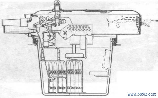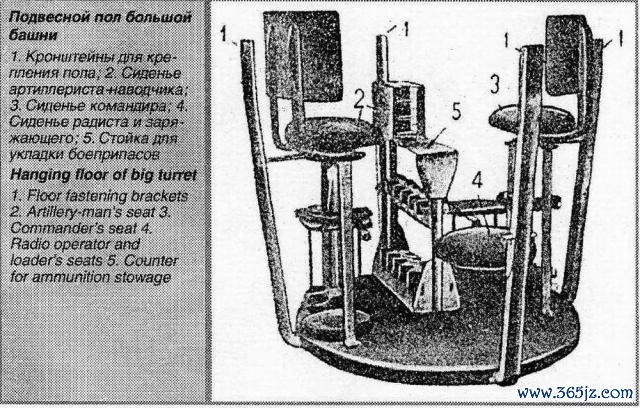 这个炮塔的底部带有一个吊篮,炮塔内存储20发炮弹,其中的8发储存于炮塔下方,分红两排,傍边各四;其余12发分红两个6发弹药架,派遣于车长和炮手座椅的下方,格外于这两个东说念主径直坐在炮弹上,吊篮的外不雅如下: