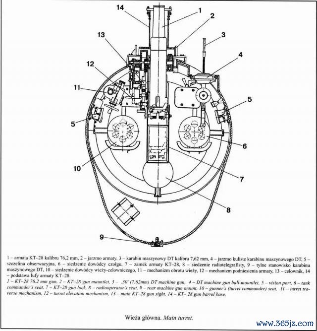 最初装备一门KT-28算作主炮,这门火炮源自相易口径的M1902三英寸炮,是专为营救步兵和攻坚想象的,身管倍径16.5,后座行程500mm,莫得反坦克智商,使用76.2×385mm的炮弹,这种炮弹在PT-76那篇著述讲过,就不浪费篇幅赘述了