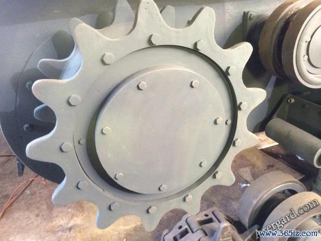 主动轮位于后方,直径796.5mm,带有13个啮合履带用的齿圈,这个齿圈不是一体锻造的,而是通过六角螺母固定在上头