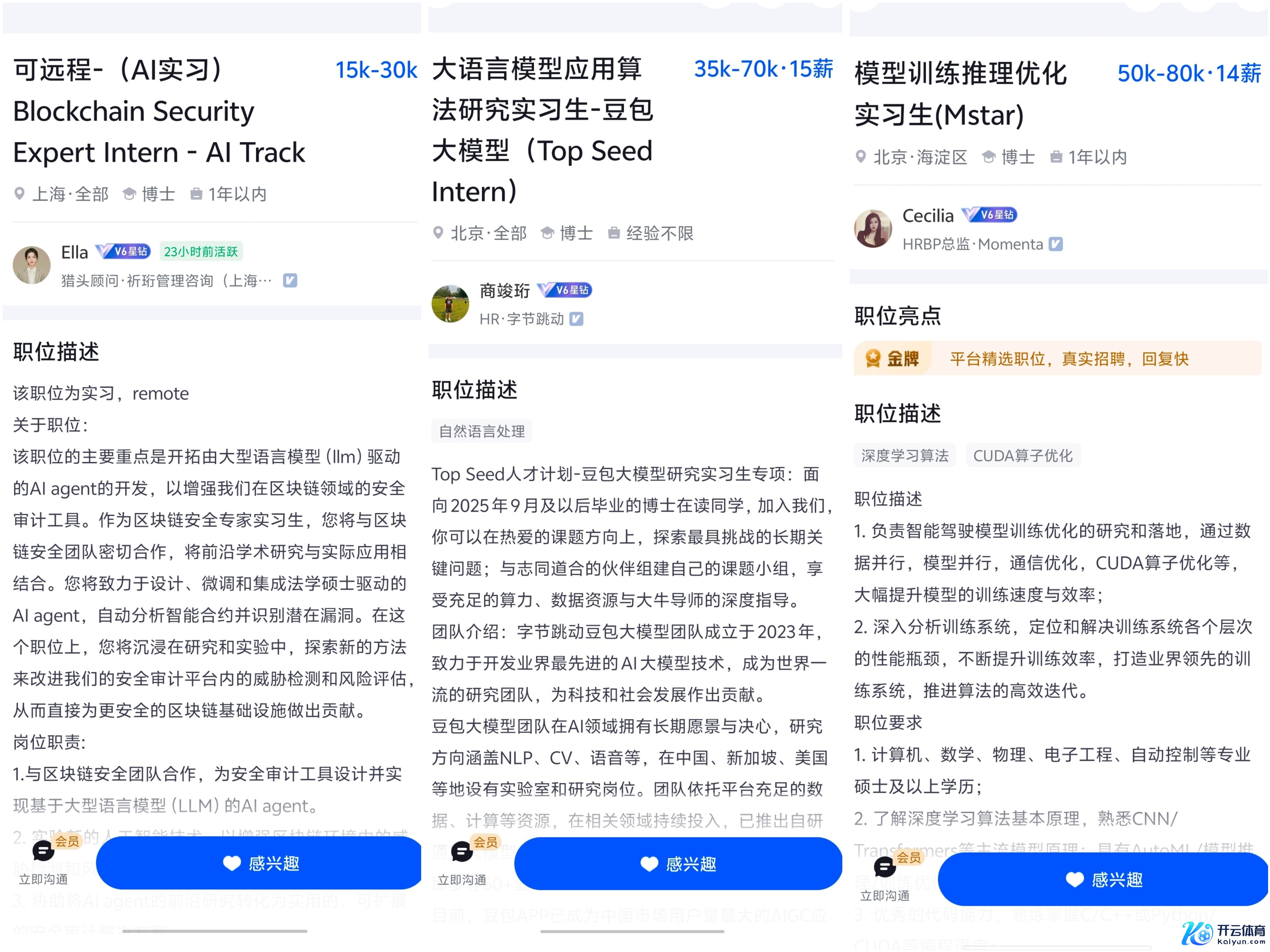 时间周报记者梳剪发现,在脉脉或Boos直聘上放出的高薪AI实习岗,应聘条目要求更高。前述MiniMax月薪7万元实习岗,天然岗亭教会要求不限,但需要在国际顶尖期刊发表过高质地论文。还有其他公司部分月薪3万~5万元的实习岗,雷同要求在顶级期刊发表论文,或是要求博士或博士在读、千般学科竞赛中获奖、具备机器学习等执行教会。