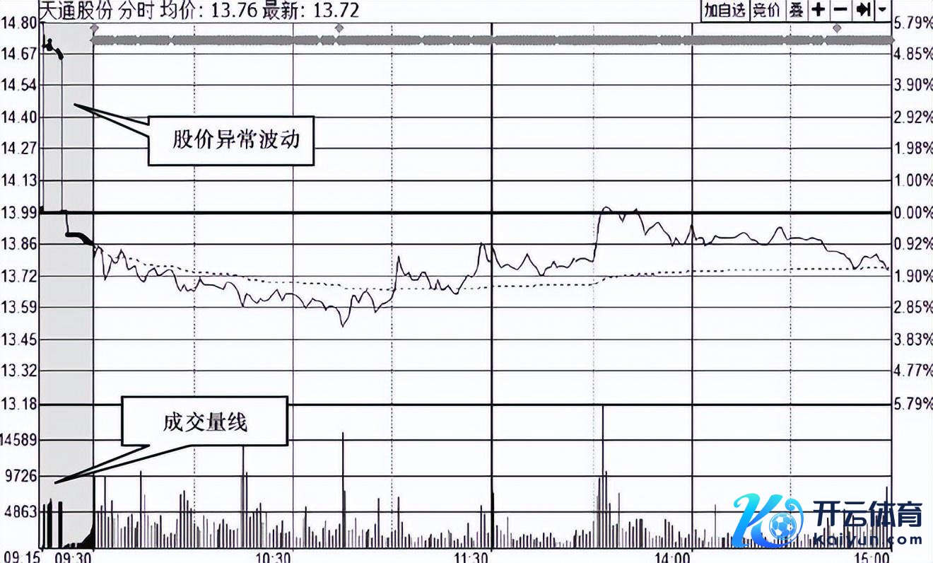 该股股价在9∶15迫临竞价运转时,曩昔一交游日收盘价运转启动竞价。后来,跟着买盘的缓缓加多,迫临竞价的价钱束缚走高,不雅察此时的诬捏成交量可知,此时成交量极低,这证据主力并未介入,股价的高潮是生意两边争斗的后果。若将来主力仍不介入,那么股价络续走高的概率较大。不外,该股认真开盘后,该股股价遭到巨量打压,并大幅回落。