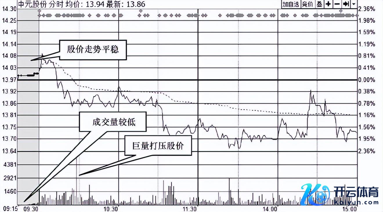 如图1-1所示,该股股价在9∶15迫临竞价运转时,曩昔一交游日收盘价运转启动竞价。后来,跟着卖盘的缓缓加多,迫临竞价的价钱束缚走低,不雅察此时的诬捏成交量可知,此时成交量极低,这证据主力并未介入,股价的下降是生意两边争斗的后果。若将来主力仍不介入,那么,股价络续走低的概率较大。底下再来看一下中元股份的案例,如图1-2所示。